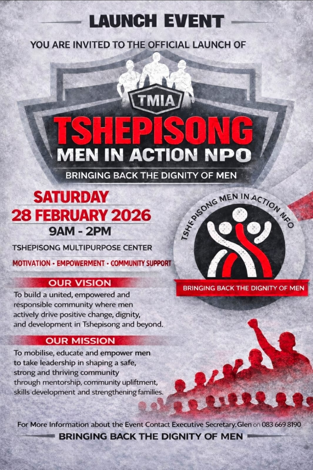 The official launch of Tshepisong Men in Action NPO is happening on Saturday, 28 February 2026 at the Tshepisong Multipurpose Center. Come be part of restoring dignity, building strength, and driving positive change in our community.